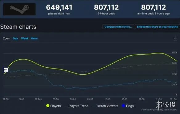 霍格沃茨之遗》可谓是近期最火的游戏之一,它究竟有多热门?据SteamDB数据显示,今日凌晨4点55分时,Steam同时在线人数达到80.7万人!其玩家数能在Steam平台排名第八,如果仅算单人游戏的话更是能排第三名。