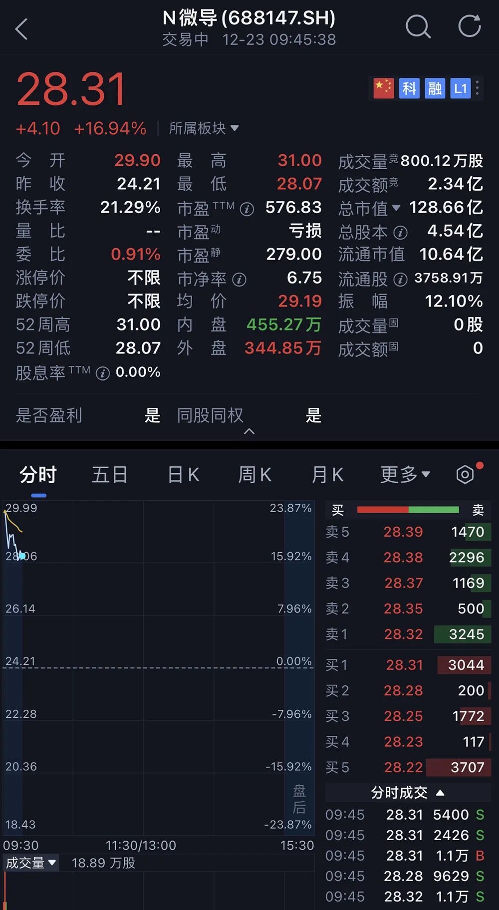 三闯科创板!国产关键半导体设备商成功上市,宁德时代曾毓群、中芯国际持股。芯东西12月23日报道,今日,江苏半导体薄膜沉积设备供应商微导纳米正式登陆科创板。其发行价为24.21元/股,发行市盈率412.24倍,开盘价为29.90元/股,涨幅达23.50%;截至09点45分,股价最高上涨28.05%至31.00元/股,总市值约129亿元。![]()