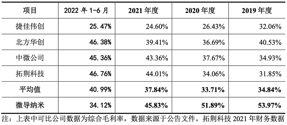 2021年,微导纳米首台半导体领域设备实现销售,毛利率为52.20%。故其半导体领域设备的毛利率高于同行业可比公司平均水平。