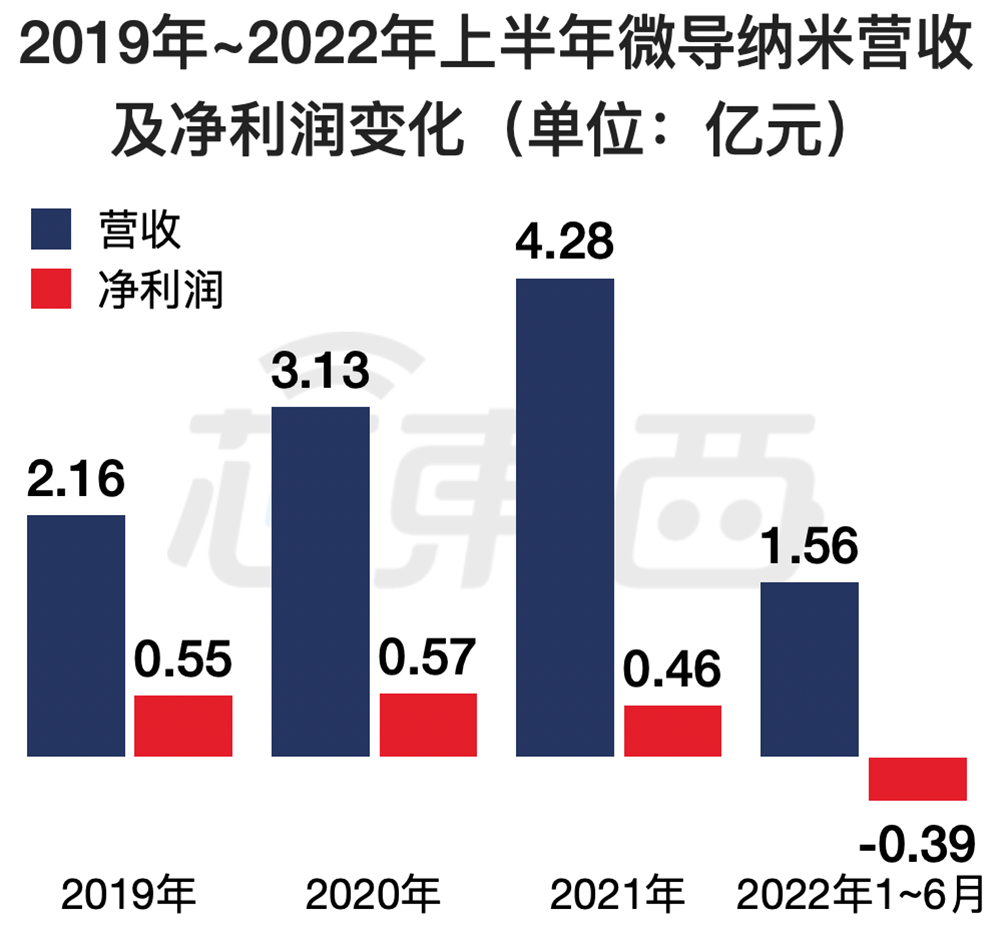 2019年、2020年、2021年、2022年上半年,微导纳米的营收分别为2.16亿元、3.13亿元、4.28亿元、1.56亿元,净利润分别为0.55亿元、0.57亿元、0.46亿元、-0.39亿元。