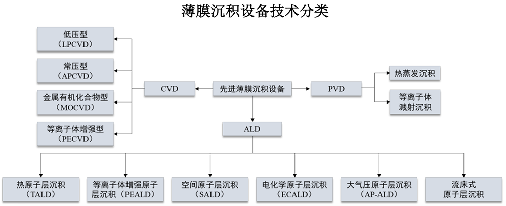 薄膜沉积设备主要应用于光伏电池片、半导体晶圆的生产环节,直接影响光伏电池片的光电转换效率以及半导体器件性能。薄膜沉积是指在基底上沉积特定材料形成薄膜,使之具有光学、电学等方面的特殊性能,按工艺原理可分为物理气相沉积(PVD)、化学气相沉积(CVD)和原子层沉积(ALD)设备,按设备形态可分为批量式(管式)和空间型(板式)两种技术路线。![]()