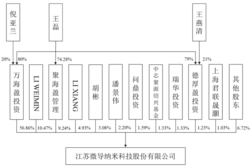 王燕清、倪亚兰、王磊系微导纳米的实际控制人。三人组成的家族通过万海盈投资、聚海盈管理、德厚盈投资间接控制公司67.34%股份。在这三家持股平台中,王磊持股均在7~8成。![]()