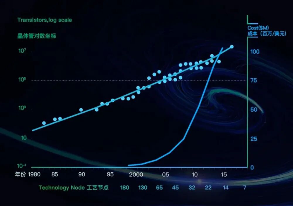 数据中心的底层算力基础设施有两大进化目标:提升算力,降低成本。叱咤信息技术产业57年的摩尔定律,凭借“每隔18~24个月芯片上晶体管数量翻番”的预言,长期被奉为指引算力飙涨的圭臬,驱动各类芯片遵循以低廉价格提供更强性能的经济路径成长。尽管工程师们竭力“续命”摩尔定律,但濒临2nm、1nm……晶体管尺寸的物理极限已近在眼前。![]()