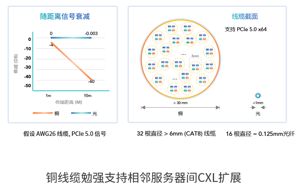 ▲铜导线传输信号随距离衰减,与光纤线缆截面对比(图源:曦智科技)