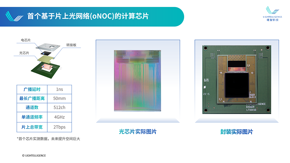 如图,中间黑色部分是曦智自研的AI计算电芯片。曦智科技将一块集成硅光芯片和一块电子芯片进行垂直堆叠,用光波导替代铜导线,让片上光网络进行数据传输,使芯片之间的距离变得最小,理论上可实现比现有transceiver高1000倍以上的集成密度。其片上光网络系统由512个波导通道组成,单个波导通道的最长广播距离大概50mm,广播延时1ns,单通道频率4GHz,片上总带宽2Tbps。“这种设计之前在光通信行业是不存在的。”沈亦晨告诉智东西,以前光芯片和电芯片就像两幢楼,要进行通信,则需先下楼、走到另一幢楼、再上楼。而将电芯片堆叠在光芯片上,则像楼上楼下,只需搭乘楼内电梯,通信成本低很多。据他分享,相比传统光芯片与电芯片分开封装的方式,将电芯片堆叠在光芯片上的光电转换功耗和延迟成本会低得多。经实测,oNOC计算产品能在1ns内完成多个计算核之间All-to-AIl的数据广播,这将大幅提高了每一个计算核的算力利用率。尽管少数海外公司也在探索光电芯片垂直堆叠,但曦智科技联合创始人、CTO孟怀宇告诉智东西,片上互连系统需要大面积堆叠,从集成度的角度考虑,曦智科技已经做到在硅光芯片中集成上万个器件,这是已公开跑通的系统中绝无仅有的,技术壁垒很高,目前全球从工程上掌握片上光网络技术的企业可能不超3家。下一步,曦智科技计划优化oNOC技术的通用性,使其能与第三方电芯片适配,并将积极寻求与更多电芯片设计厂商的合作。除了提升芯片内部的带宽外,光网络也正拓展至更多服务器之间,酝酿一场改变数据中心通信效率的技术革命。
