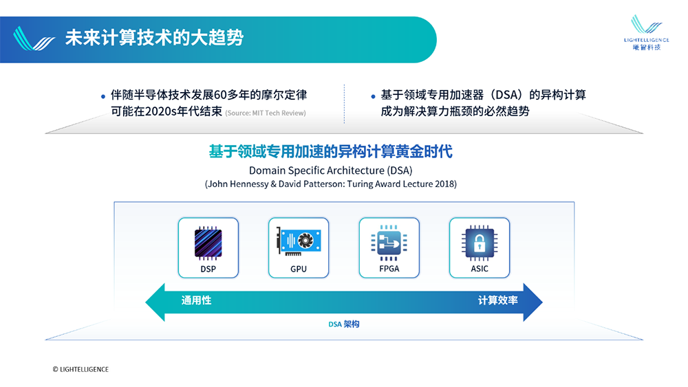 面对飙升的算力需求,传统数据中心算力基础设施的架构,多少有些撑不住了。第一扇门是提高单芯片算力,有两条路径司空见惯,一是迭代制造技术,二是优化架构设计。迭代制程工艺是为了持续缩小晶体管体积,以在同等面积的芯片里塞进更多晶体管,实现性能提升,但这条路正变得越来越难走。架构创新正呈百家争鸣之势态,以CPU、GPU为代表的通用芯片难以满足差异化场景的算力与能耗需求,促使异构计算大行其道。异构计算的本质是精细化分工,让不同架构的芯片各展其长,通过排兵布阵,使多类计算资源能够更大限度地发挥到实际场景中。这为特定领域架构(DSA)的繁荣提供了优渥土壤,并催生了光子芯片等创新品类。相比通用芯片,DSA芯片往往能提供更高的性能与能效。![]()