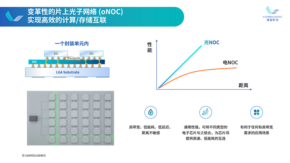 当你上网查询资料、开视频会议,数据会通过光纤网络,传输至遥远的数据中心。等进入芯片内部,基于铜导线的互连开始负责将数据在计算单元、存储芯片之间来回搬运。但物理材料的局限性,使得铜互连仅适合近邻数据传输。随着晶圆级计算、Chiplet等大芯片设计方案日渐盛行,暴涨的算力需求驱动拼装的核心或Chiplet数量越来越多,芯片面积越来越大,而数据传输距离变长,铜互连的边际成本就会急剧上升,导致延迟、功耗增加,性能严重下降。此时,如果能将光子引入片上互连,也许能大幅提升计算单元与存储之间的通信效率。假如将芯片内的数据传输视作城市里的交通,铜互连好比骑单车,适合短途出行,跑长途就得面临速度有限、非常消耗体能等问题,光互连则像乘地铁,对于城市内较长距离的出行,是更高效且不费力的选择。相比铜互连,随着传输距离变长,光信号的损耗要比电信号低几个数量级。理想情况下,对超过1~2cm的数据传输,使用光作为传输介质更具优势,为解决带宽及容量瓶颈带来更多可能。2017年创立的曦智科技,是少有的片上光网络先行者。在上周五举办的第二届中国互连技术与产业大会上,它刚刚预告了世界上第一款基于片上光网络(oNOC)的计算产品。▲片上光网络可实现高效的计算/存储互连(图源:曦智科技)