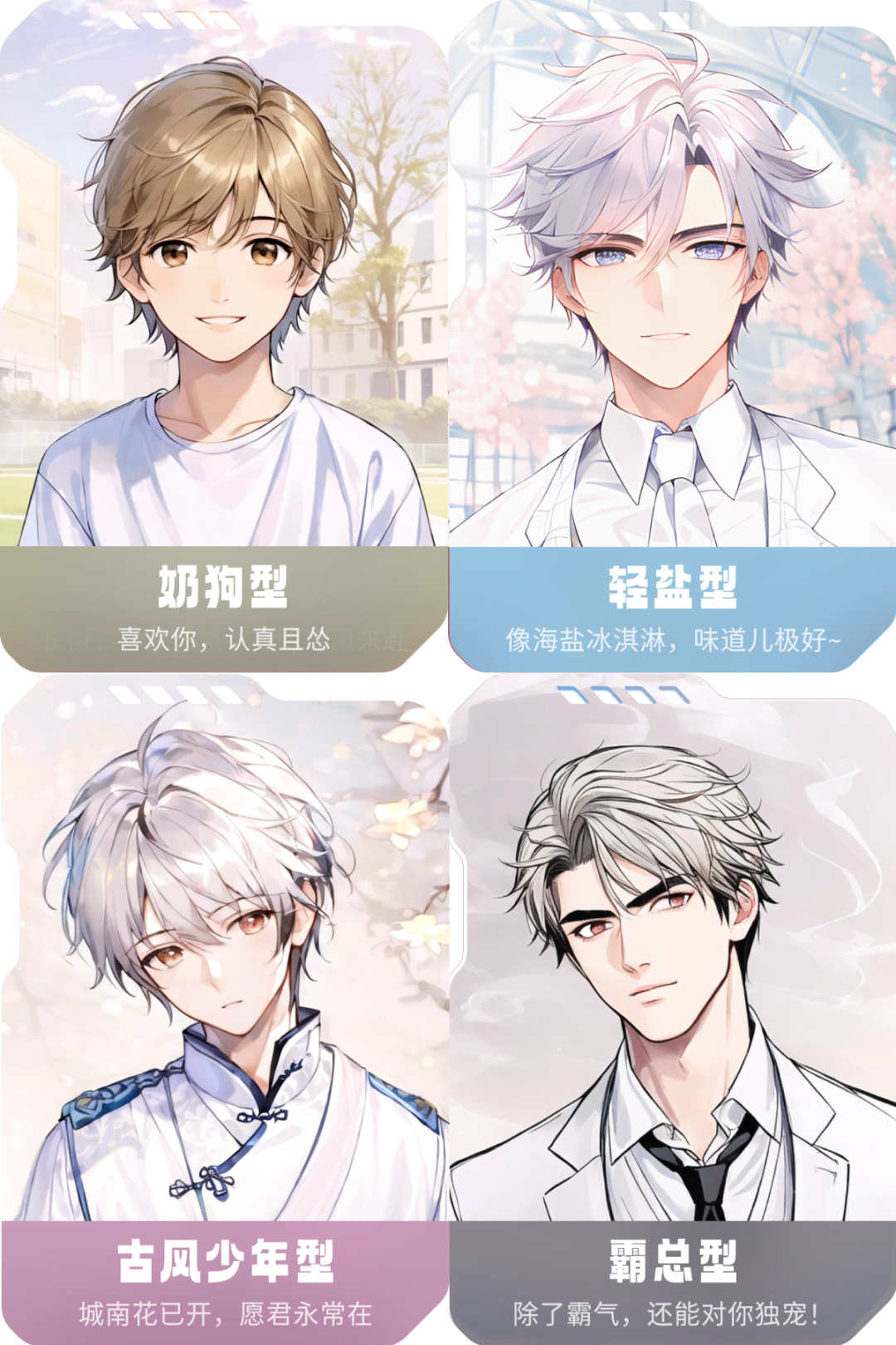 不仅是二次元老婆,二次元老公也是可以的,也有不同的口味,不论你是喜欢霸道总裁,还是清爽盐系,都能找到称意的选择。