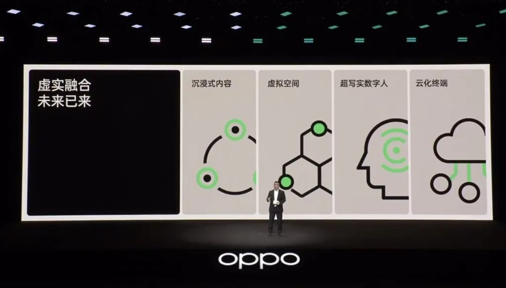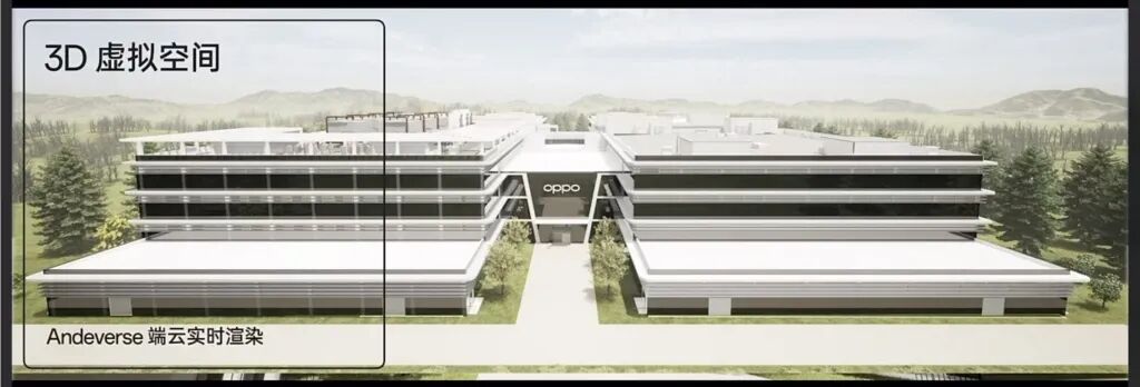 就现阶段而言,机器人是AI主动智能的一种较为极致的探索,而这为其他终端的主动智能进化释放了积极信号。成为虚拟世界引擎,复刻真实世界。虚实融合作为新的流量热词,未来,这一产业是否会像手机一样深入我们的日常生活尚不可知,但可以预见的是,其带来的产业变革正在加速发生。然而,真正虚实融合的世界背后,需要的是支持PB级场景数据存储与海量算力引擎的能力。OPPO音视频技术负责人郑晓川分享了一个关键数据,仅1PB的数据量,就需要2048个512GB大小的手机存储空间。显而易见的是,端侧无法承载如此之大的存储空间并进行算力支撑,虚实融合需要端云协同。OPPO基于端云实时渲染引擎Andeverse,搭建3D虚拟空间,并且用摄像头扫描现实空间将其中的空间、建筑、物体等复刻成3D化的虚拟物体,再投射到虚拟空间中。真正让用户体验到身临其境。![]()
