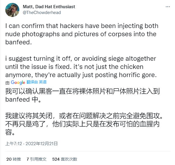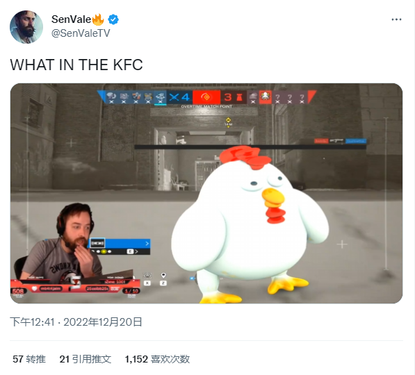 自12月20日起,推特上陆续有《彩虹六号》的主播反馈,他们的游戏画面偶尔会被一只卡通画风的白色大公鸡盖住。