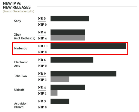 许多玩家都感叹任天堂进入NS时代这5年来,平均每月1款游戏的稳定产出属实有些恐怖。但与此同时,也有不少玩家注意到了这张图标中的另一个数据:新IP——过去一年中,任天堂的新IP又是0个。