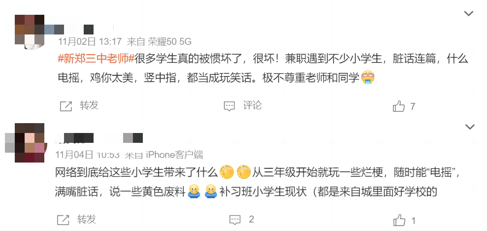 而在网络世界的另一头,成年人现在正在饱受这些小学生“暗号”的折磨。相比于当初对《孤勇者》中二的模仿和传唱,如今小学生群体中最流行的“电摇”,似乎总伴随着脏话和竖中指等不雅行为一同出现,这引发了不少网友对于小学生模仿短视频内容的反感。