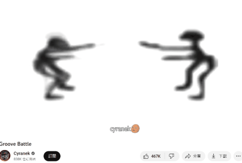 这个梗最早起源于YouTube上一位名叫“Cyranek”的博主,所制作的鬼畜视频《Groove Battle》。视频的主要内容,就是两个长得很像外星人的黑色小人,在一段非常魔性的音乐伴奏下,随着节奏交替着快速蹲起,既像是在比拼舞技,又像是在互相挑衅对方。在长达三分钟的视频里,两个小人就这样你来我往,上演了一场人类难以理解的抽象博弈。