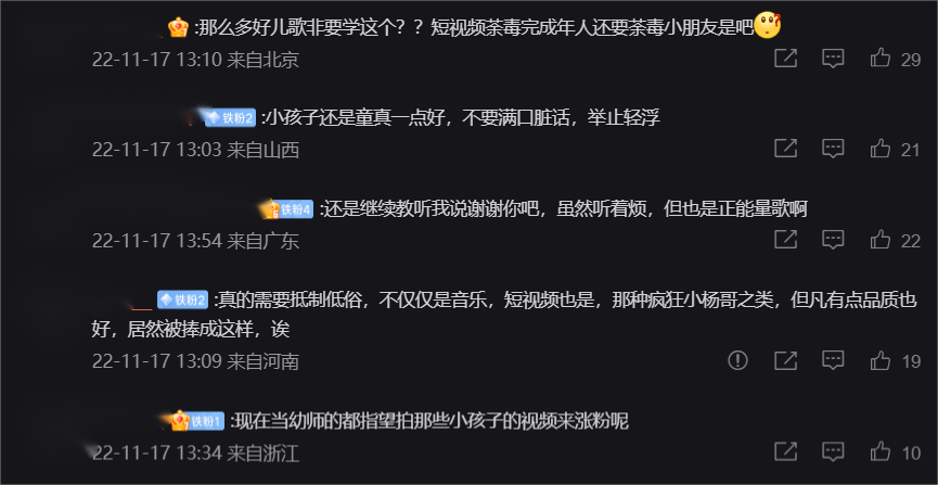 而在相关新闻的评论区,吃瓜网友们也难得和家长们站在了同一条阵线上,纷纷表示这样的歌曲相比《孤勇者》来说,确实不适合在未成年群体中传唱。但也有一部分网友,选择直接将炮火对准了如今的短视频行业,认为短视频既“荼毒”了成年人,也“荼毒”了小朋友。