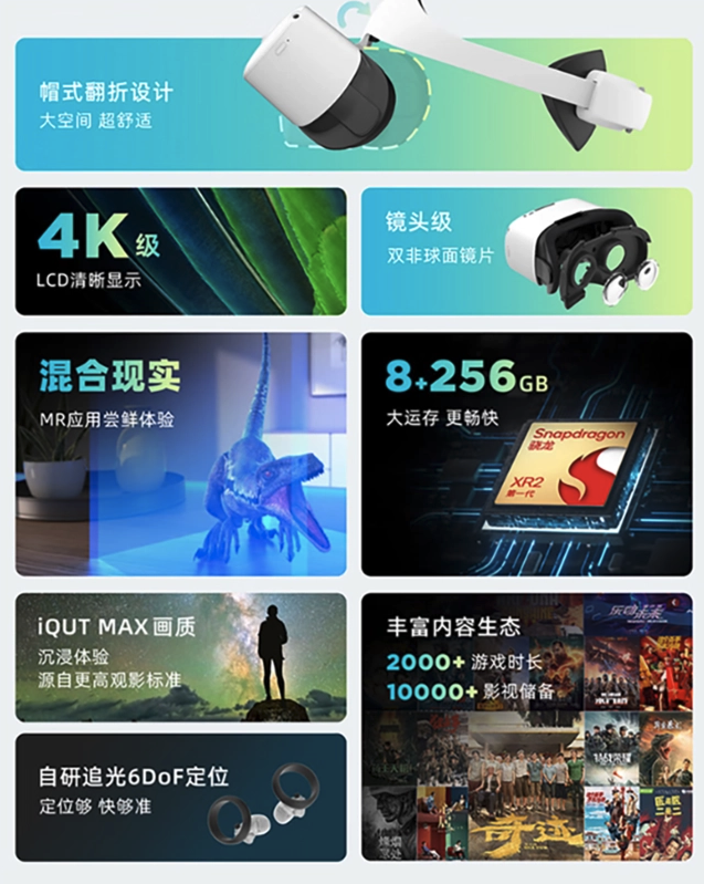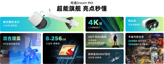 本次发布的新品奇遇MIX依旧沿用高通旗舰级XR处理器——骁龙XR2,运行主流游戏毫无压力;标配8+256GB存储,用户可以将自己爱玩的游戏都保存进去;主机配备两颗1600万像素透视专用全彩摄像头,搭载双目全彩透视技术实现与真实世界直接交互,即通过相机捕捉到实时画面,将虚拟世界和真实世界合成后,呈现多种色彩的显示画面,对周围物体和自身移动的感知也更精确,视觉偏差、畸形更小。