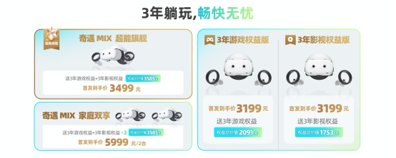 “3年影视权益版”首发到手价3199元,包含奇遇MIX主机1台、3年影视权益(用户首年赠送1年奇遇年卡,第二、三年每年可自由领取1年奇遇年卡),首发用户额外赠送5款热门游戏,主机外权益总价值1752元;