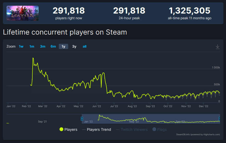 《Lost Ark》于今年二月份在Steam上线,一度火爆异常,并曾创下132.5万人的峰值同时在线玩家数记录。