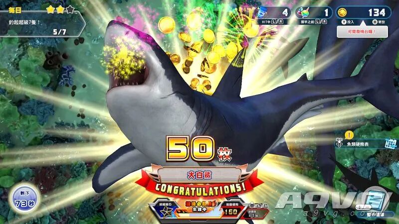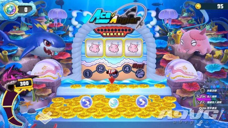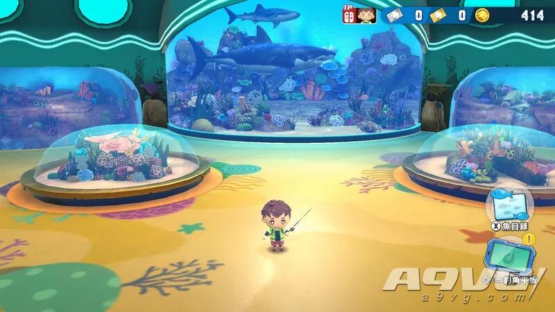 作为一款续作,《欢钓水族馆》也在原有的基础上为游戏增添了多种全新玩法,同时作为一款“街机”玩法的衍生作品,游戏的核心思路便是以“收集金币”作为展开,以此拓展出了诸如扭蛋收集水族馆的鱼类、参与不同的游玩模式以及最基础的钓鱼,而一切能参与的活动也都是为了收集金币做出的服务,可以说在这里除了转扭蛋以外,其他手段都可以让玩家获得一定数量的金币,后续再用金币去游玩不同设施,最终形成了一套“闭环”。 此之前的《集合啦!动物森友会》评测里,我曾经提到过,以我个人而言,特别喜欢那种让玩家通过不同方式将一个空荡荡的水族馆填满的玩法,看着展厅渐渐从无到有,这个过程中产生的兴奋感是很多类型都不能给予的。而既然副标题被叫做《欢钓水族馆》,这套水族馆的“经营”模式也自然而言地带入到了游戏里,只不过稍有遗憾的是,本作的填充鱼缸的手段并非是按照平时钓上来的鱼计算,而是需要玩家花费金币或者扭蛋转动大厅中央的扭蛋机获得,不过介于收录鱼类种类的丰富程度,从现有的到远古存在的,再到已经灭绝的,甚至还会出现一些极特别的种类,这一收集过程虽说没有那么直接,但也带来了不小的满足感。 以往的剧情模式在本作中也得到了保留,从该模式的标题“毒毒传说”就能看出,本作的故事是以“保护海洋环境”作为核心,在这里我们将以主角的视角去接触各式各样的角色,与他们一起去拯救被各种工业垃圾,有毒物品所污染的海洋,不同于传统的街机模式,在这里游戏还会带来一些额外的玩法套路,类似钓鱼过程中会出现不同的垃圾,除了钓鱼以外你还需要用钓竿去勾起这些污染海洋的污染物,随后便会得到必杀能量的奖励。随着主线剧情的推进,游戏还会为我们介绍各种不同海洋生物的知识,也算是将寓教于乐完整地融入到了这套游戏的体系里。 对比街机模式,剧情模式在很多地方都带来了比较宽松的设计,像是可以无限使用的必杀技和一些可以供玩家快速上手的基础任务、挑战目标等元素,如果你只是初来乍到,并不太了解《王牌钓手》的玩法套路,那么大可将剧情模式当作步入街机垂钓的第一步。 相对于前作而言,《欢钓水族馆》在原有的基础上并没有带来什么太过破天荒的创新,而是在此前的框架之上填补了更多的玩法创意,让本作无论是自己一人垂钓还是和三五好友一起坐下来共同奋战,都能起到不错的氛围烘托效果。多人模式下除了常规的垂钓模式外,还衍生出了摩托艇、打靶等多种可供同乐的小游戏,尽管在玩法上它们和本作的核心并没有什么直接关系,但在聚会或是闲暇的空档期,偶尔来上一局,在乐趣程度上本作丝毫不亚于很多聚会为主的作品,不过要说遗憾的话,可能就是类型确实少了一点。 除此以外,作为新增要素“鲨鲨狂热潮”则是将推进游戏关键的“金币”更直接地带入到了玩法里,而关于它的玩法,就像垂钓模式一样,只要你曾经去过街机厅或者哪怕只是看上一眼,我想都能很快地了解这套玩法想让你去做些什么,不断投入金币用后边的金币推动前边的,使其掉落便可以获得相应的奖励,而当有金币掉进前方的红网里时,还能触发屏幕上方的老虎机,从而解锁独特的垂钓鲨鱼玩法。可以说在对常规垂钓模式产生疲劳后,不时来上一局“鲨鲨狂热潮”也是个不错的选择。A9VG体验总结
