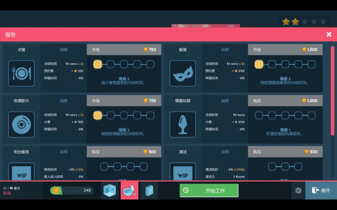 经营游戏愣是玩出了《分手厨房》的手忙脚乱。期间客人还会提出一些要求,比如点餐服务、安全套服务、小电影服务、助兴玩具之类,都要一个个满足。