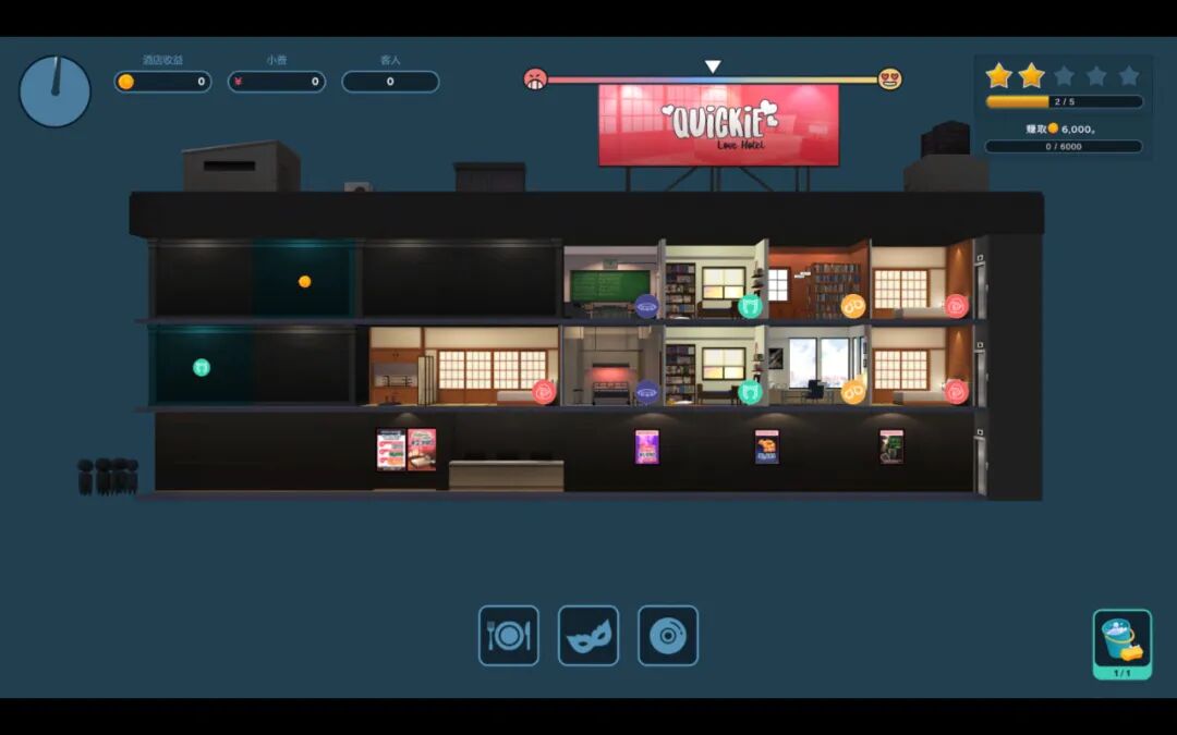 平时在一个类似《辐射避难所》的横断酒店图里进行规划建设,不同的房间有不同的风格,每天开业后根据客人需求进行安排入驻。