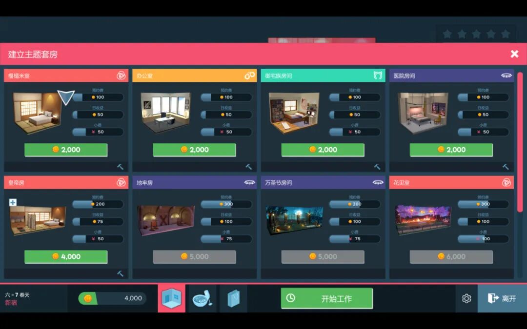 这些道具会给套房增加BUFF,比如增加客人的消费、加快房间使用速度之类,进而提高总收入与情趣酒店的品质。