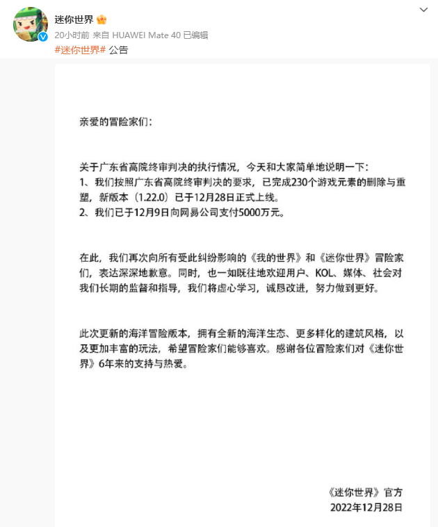 今日,《迷你世界》终于发布了道歉公告,表示已完成对230个游戏元素的删除与重塑,也于12月9日向网易支付了5000万元赔偿金。