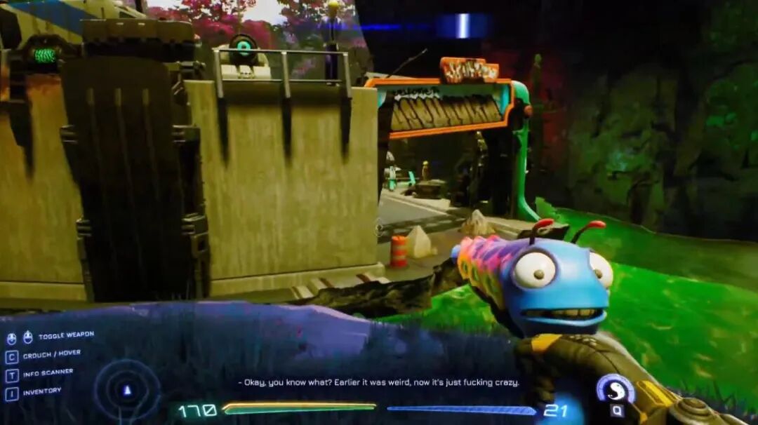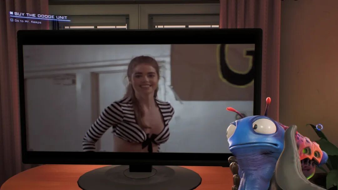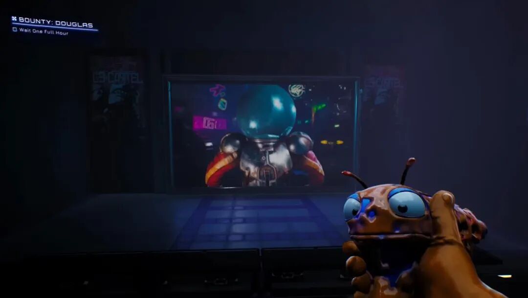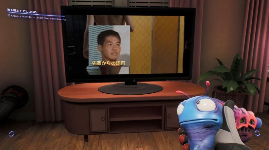 再举一个例子,你知道很多游戏,都会给自己的电视里录一些小节目,对吧。《High on Life》也是,它的主城里四处都是电视机,播放的节目极具个性,还会随着时间段波动而改变。有时你看到的是一个外星明星在采访中,不慎说出自己喜欢*海龟,然后演变成一系列丑闻;有时你看到的是奇怪又搞笑的外星小品。