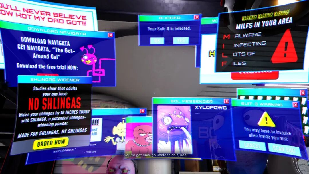 游戏本身的基调也很像《瑞克和莫蒂》,在这里,你能接触到各种让造物主怀疑人生的外星文明,看到瑰丽怪诞的外星建筑;然后,你还能看到一堆颠覆性的剧情设定,以及海量屎尿屁段子,它们虽然低俗,又很有创造力,堪称屎尿屁段子中的波尔多红酒。