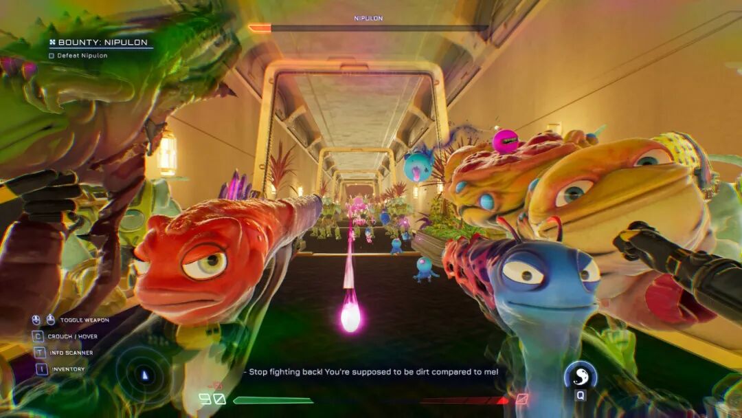 比如其中有个BOSS会先伪装成市民骗你,但有一把枪能识破它的谎言,带你进入一个隐藏BOSS战。《High on Life》基本把这四把枪当成四个RPG里的队友来做了,存在感极强,不知道它们的台词量到底有多夸张。