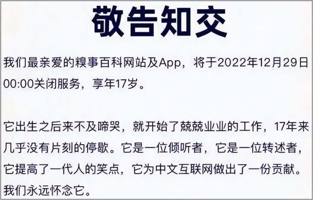 糗事百科近日发布公告称,糗事百科网站及App将于2022年12月29日00:00关闭服务,官方公众号还将继续运营。