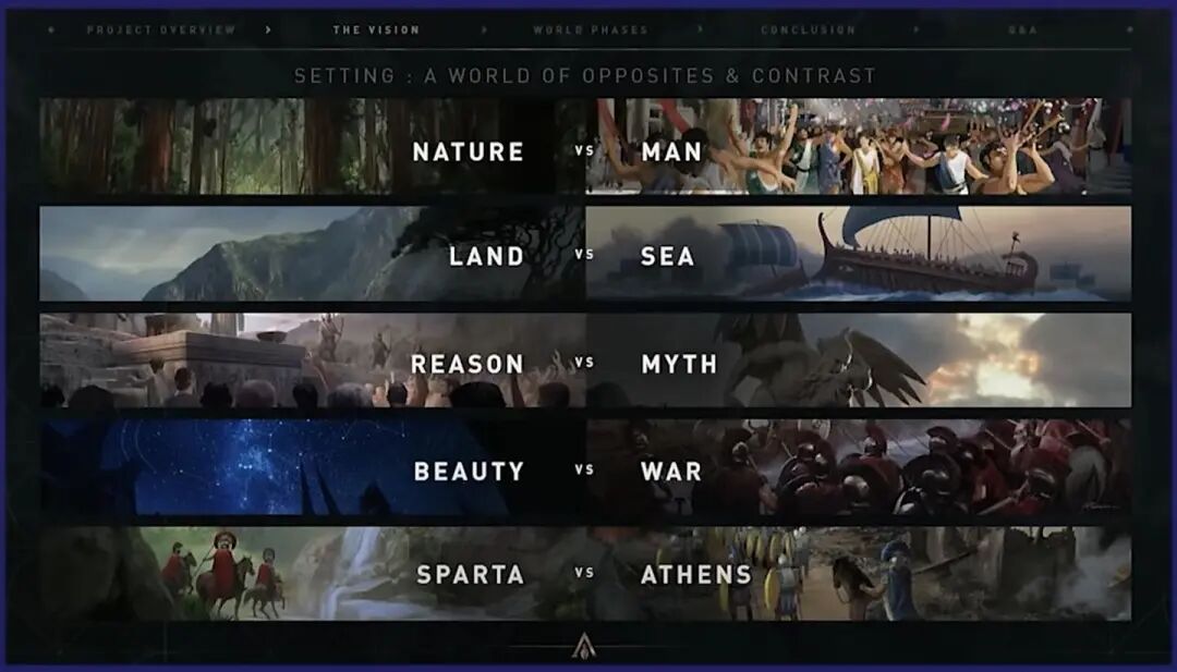设计师通过对比的方式,凸显每个区域的特征。通过改变城市和乡村的相对比例,活用建筑风格、环境结构,为玩家呈现出可快速构建认知的游戏空间。在一期 GDC 演讲中,《奥德赛》的世界设计总监本杰明·霍尔(Benjamin Hall)表示,“即便我们做的是一款基于历史的游戏,但不代表我们要复刻历史。概念原画艺术家们消耗了大量的创造力和想象力来构建这个虚拟空间,尤其是古早时期,游戏世界对应的真实场景已然消失在历史的洪流中,留下的不过几砖几瓦而已”。[3]