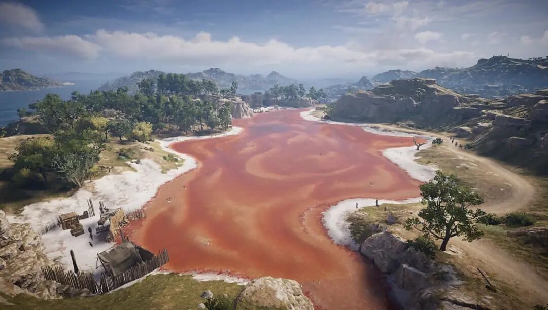 穿越时间的洪流,玩家松开了杀戮的手指,卡珊德拉随即停下了疾行的脚步,而伊卡洛斯飞旋在高空中鸟瞰着远方。黄昏的阳光散落在房屋上,清澈的海水拍打着礁石, 精白的盐粒堆成小山,五颜六色的船帆划破海水,不远处,血红的湖水静谧地映射着黄昏。这里是《刺客信条:奥德赛》描绘的古希腊罗可里斯,一切看起来是如此的真实又神圣。