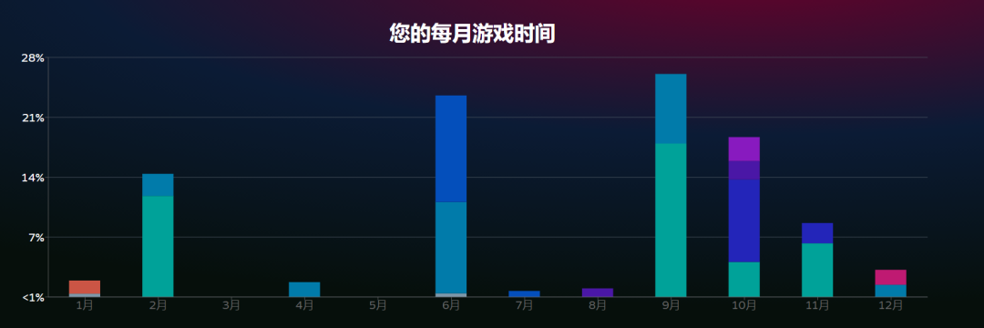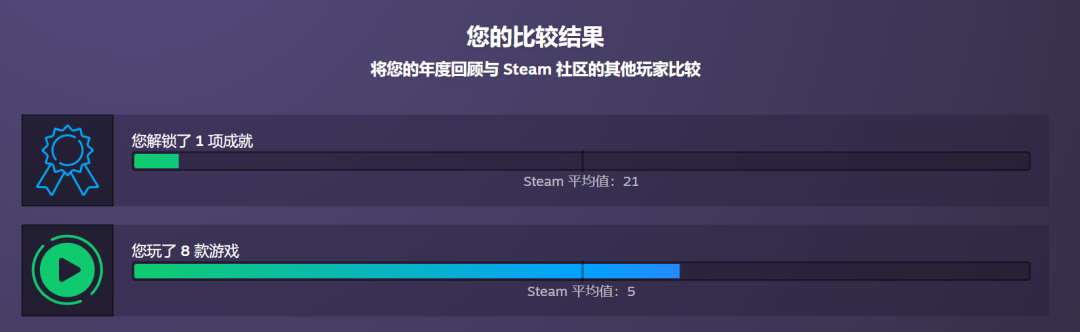 来看看你自己的Steam年度回顾专题页吧,其中可以查看自己本年度游玩时长最多的游戏,自己的每月游戏时间、解锁成就数目等内容,传送门如下: