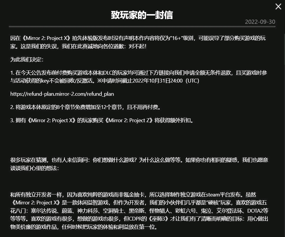 《Mirror2》系列原本的计划是做成“X” “Y” “Z”三个不同类型的游戏,跟玩家搞欺诈的是已经发售的《Mirror2:Project X》。简单点说欺诈了什么:答应玩家瑟瑟,却没有瑟瑟,并发文表示游戏定级16+,给玩家们当头一击,属实是割一波韭菜再强行送走。