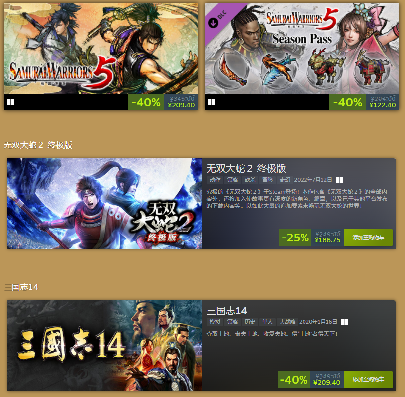 光荣特库摩Steam冬促页面已上线,最低二五折,传送门如下: