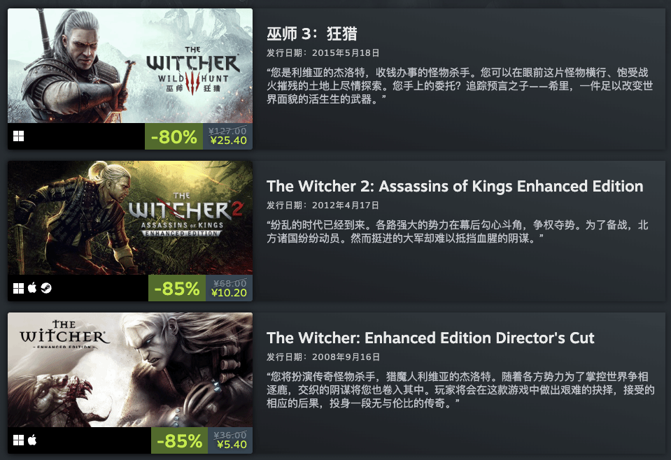近日,CDPR旗下多款作品迎来折扣,《巫师3》25.4元、《巫师1》5.4元、《巫师2》10.2元,包含这三款游戏的组合包仅售36.9元。