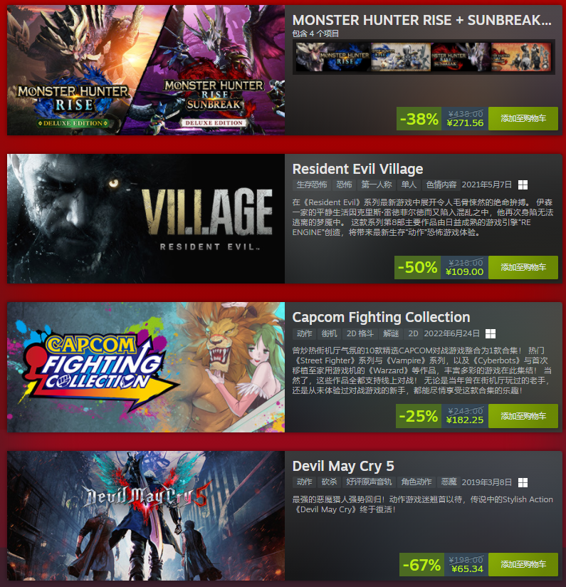 Steam冬季特卖活动现已开启,目前卡普空Steam特卖页面已上线: