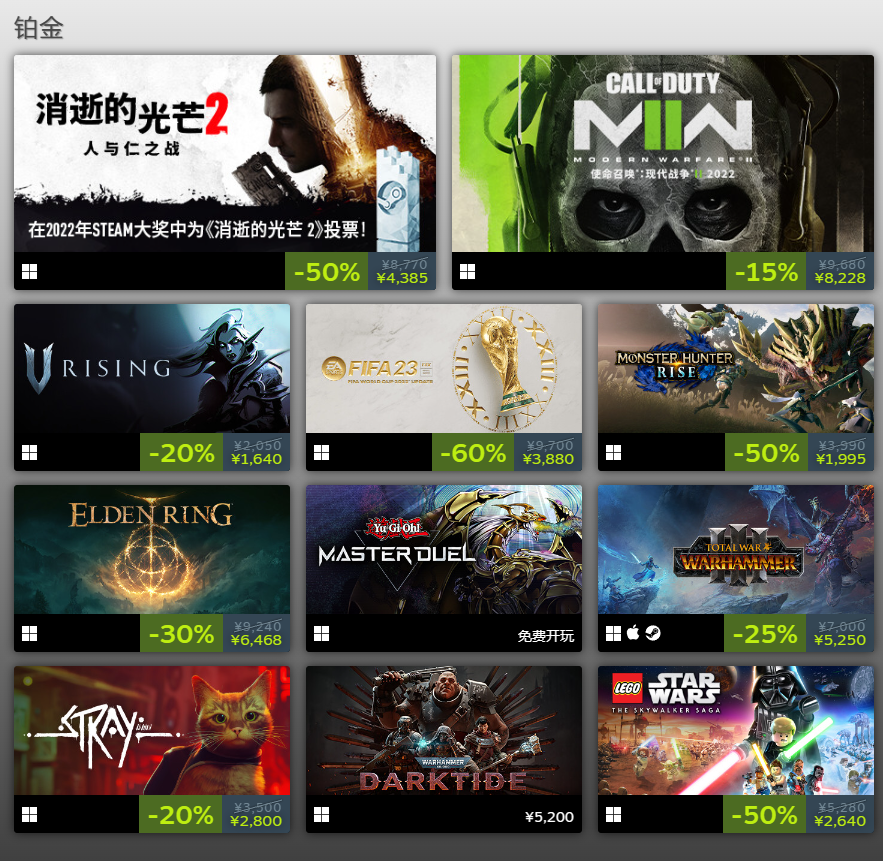 铂金名单有:《游戏王:Master Duel》《消逝的光芒2》《艾尔登法环》《使命召唤19:现代战争2》《夜族崛起》《FIFA 23》《全面战争:战锤3》《乐高星球大战:天行者传奇》《战锤40K:暗潮》《Stray(迷失)》《怪物猎人:崛起》