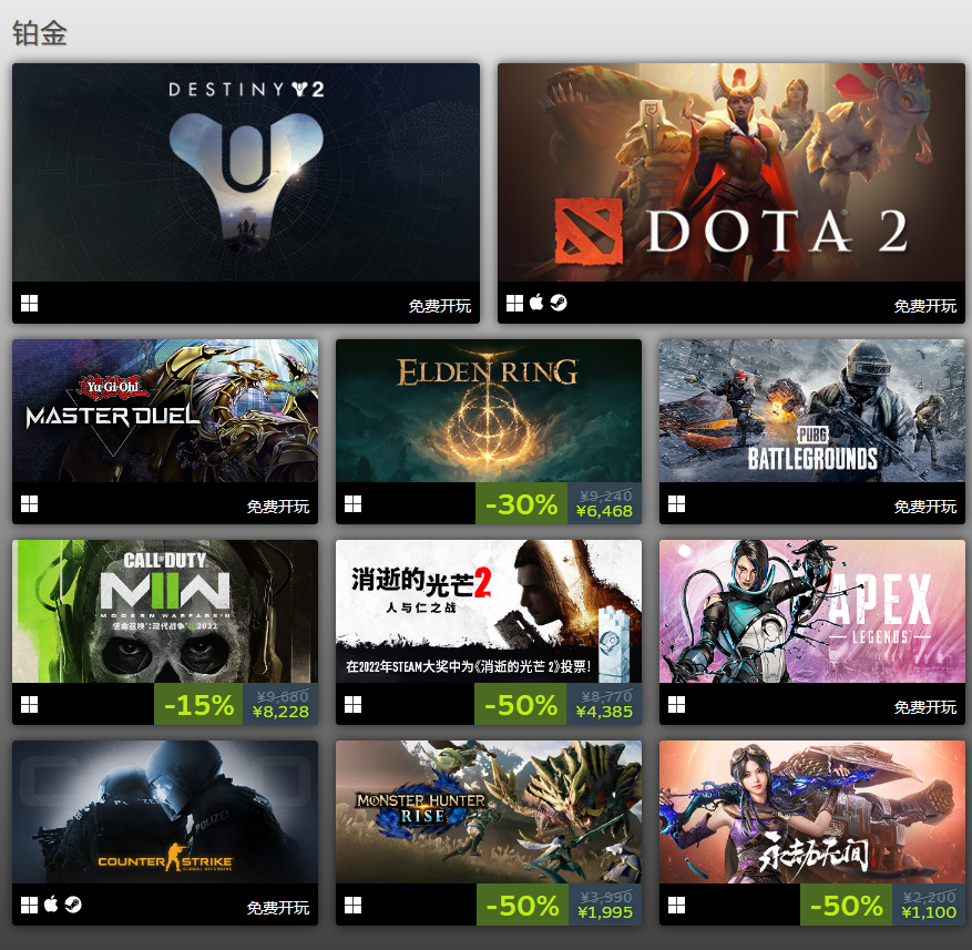 铂金名单有:《艾尔登法环》《命运2》《Dota2》《永劫无间》《Apex英雄》《CS:GO》《PUBG》《消逝的光芒2》《COD19》《游戏王:Master Duel》《怪物猎人:崛起》