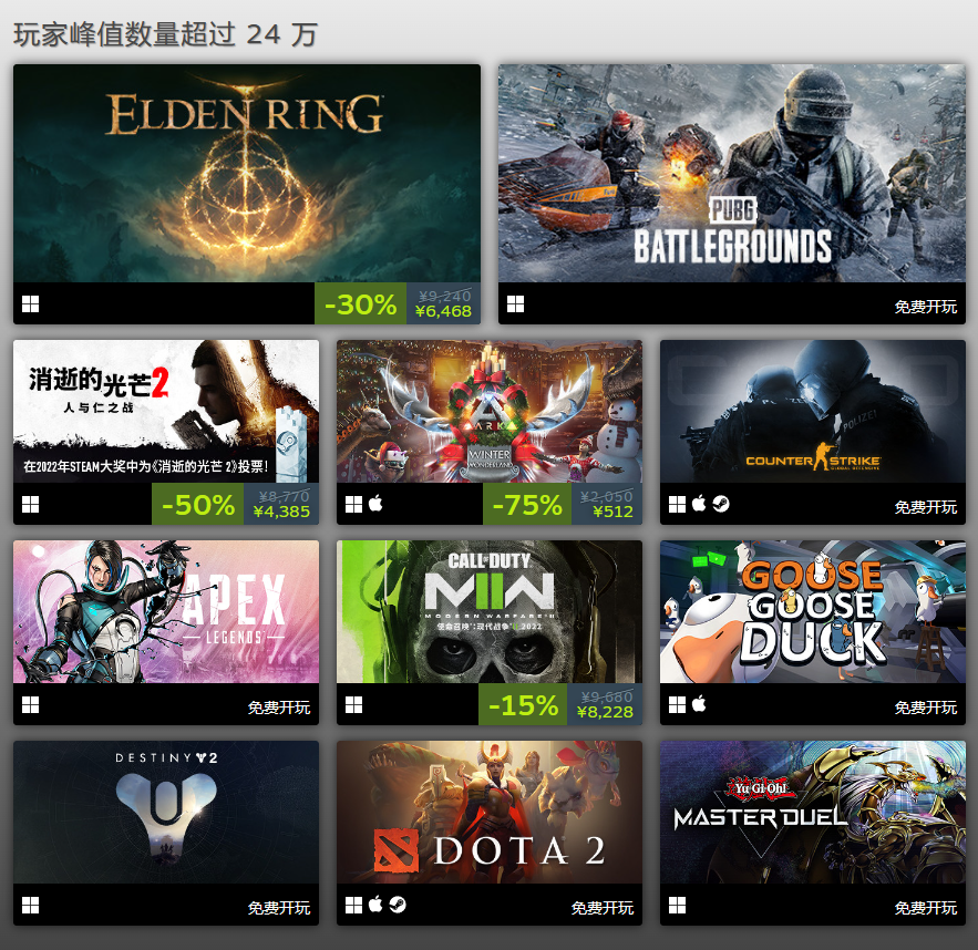 可以看到,最热玩榜单除了常驻的几款热门网游,今年上线的3A大作《艾尔登法环》《消逝的光芒2》以及经典IP《游戏王:Master Duel》也不负众望的成为榜单新秀,其中《艾尔登法环》在上线不久后在线人数峰值直破95万人,创下了历史在线数排行榜第六名的成绩。