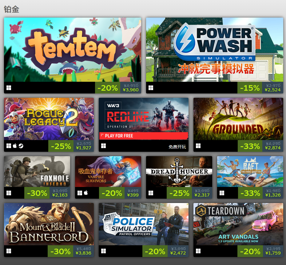 铂金名单有:《Temtem》《冲就完事模拟器》《盗贼遗产2》《吸血鬼幸存者》《Grounded》《Foxhole》《Dread Hunger》《木筏求生》《骑马与砍杀2:霸主》《警察模拟器:巡警》《Teardown》