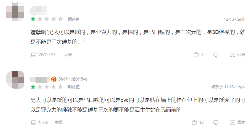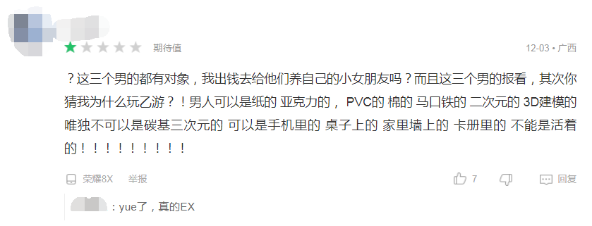 殊不知,这种做法犯下了女性玩家大忌:乙游的男主绝对不可以是碳基的。就像一些玩家评论的:“男人可以是纸的,可以是马口铁的,可以是pvc的,可以是贴在墙上的,挂在包上的,可以是纸壳子的,可以是亚克力的,唯独不能是碳基三次元的,更不能是活生生站在我面前的”。到现在,《代号:海》在TapTap和好游快爆上的评分仅为2.8和3.5,超90%的玩家给出了1星差评。