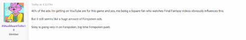 Reddit网友反映,他在Youtube上收到的广告中有40%是关于Square Enix的新游戏《Forspoken》的,索尼似乎在全力以赴的对这款游戏进行宣发。