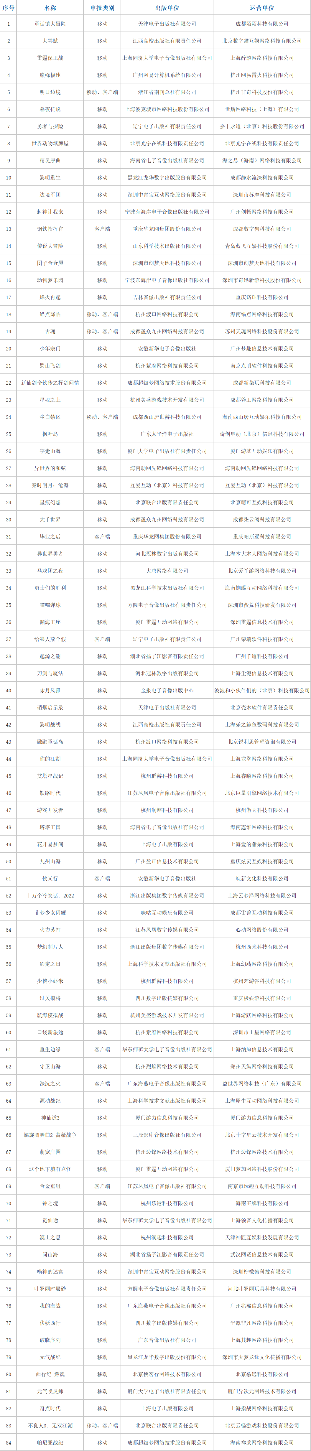 84款国产网络游戏完整版号名单如下: