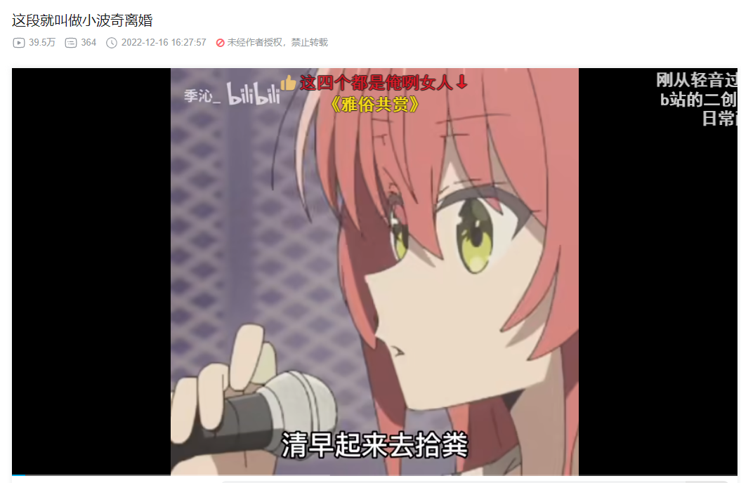 本季度话题性最强的作品没有之一。这几天你能看见无数写动画的、写游戏的、写手游的媒体都写了关于《孤独摇滚》的文章。动画二创区全靠孤独摇滚的各种逆天活拯救。