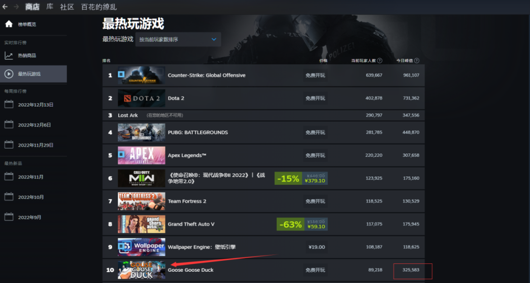 根据 Steam 在线统计数据,游戏《Goose Goose Duck》,中文名《鹅鸭杀》,目前 Steam 同时在线玩家数在 26 号异常飙升至 30 万,目前热门榜排名第十。而在几个月前,该作的日平均玩家在线数量还不到 1 万。