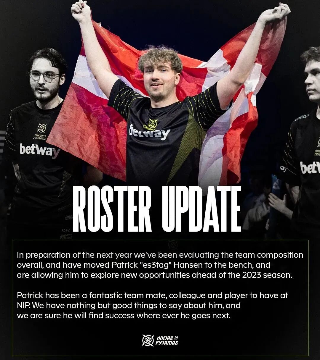 A大消息:NIP俱乐部宣布将es3tag换至替补席,他可以自由选择其他队伍邀请。NIP在2022年大赛中始终未能有所突破,这个变阵并不奇怪,至于谁来填补空位,师母已呆。