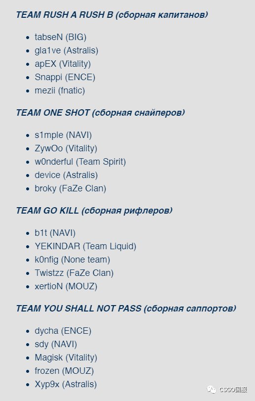 有趣的是他们将按照队伍中的位置分为4队,一队全狙击手,一队全指挥,一队全突破,一队全自由人。本次比赛的看点是,狙击手队会不会起5把大狙呢?他们会不会因为抢狙打起来呢?(doge)而且魔男和九爷在这回又成为了队友……
