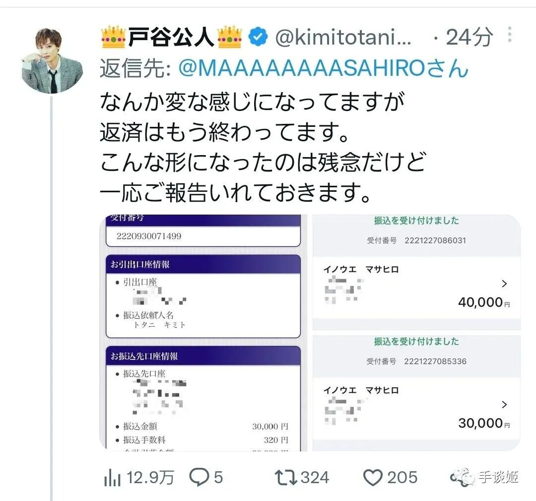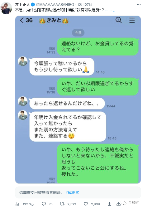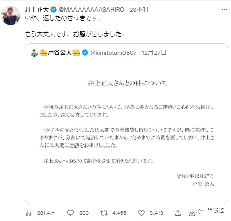 接着户谷就发了一个类似声明的东西,说自己已经分期还款还完了,并表示自己给井上带来很大麻烦深感抱歉。而井上也转发了这个声明,总之把钱还上就算结束了。