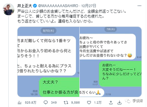 手谈姬倒也不太关注日本艺能界,根据网友说法,户谷一共从井上那儿借了折合约5000人民币,这个数目虽算不上小,但对于借钱来说肯定也算不上多,对于正常人来说只要有心肯定是能还的。